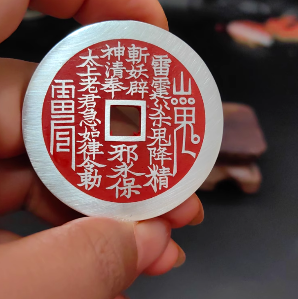 Cast from 999 fine silver, this round–square talisman revives the ancient Chinese fang-kong coin (round heaven, square earth). The face is engraved with thunder-and-mountain seals and warding scripture traditionally known as Shan-Gui Hua Qian—a protective charm used to disperse ill winds, pacify restless energies, and invite auspicious Qi into one’s field.